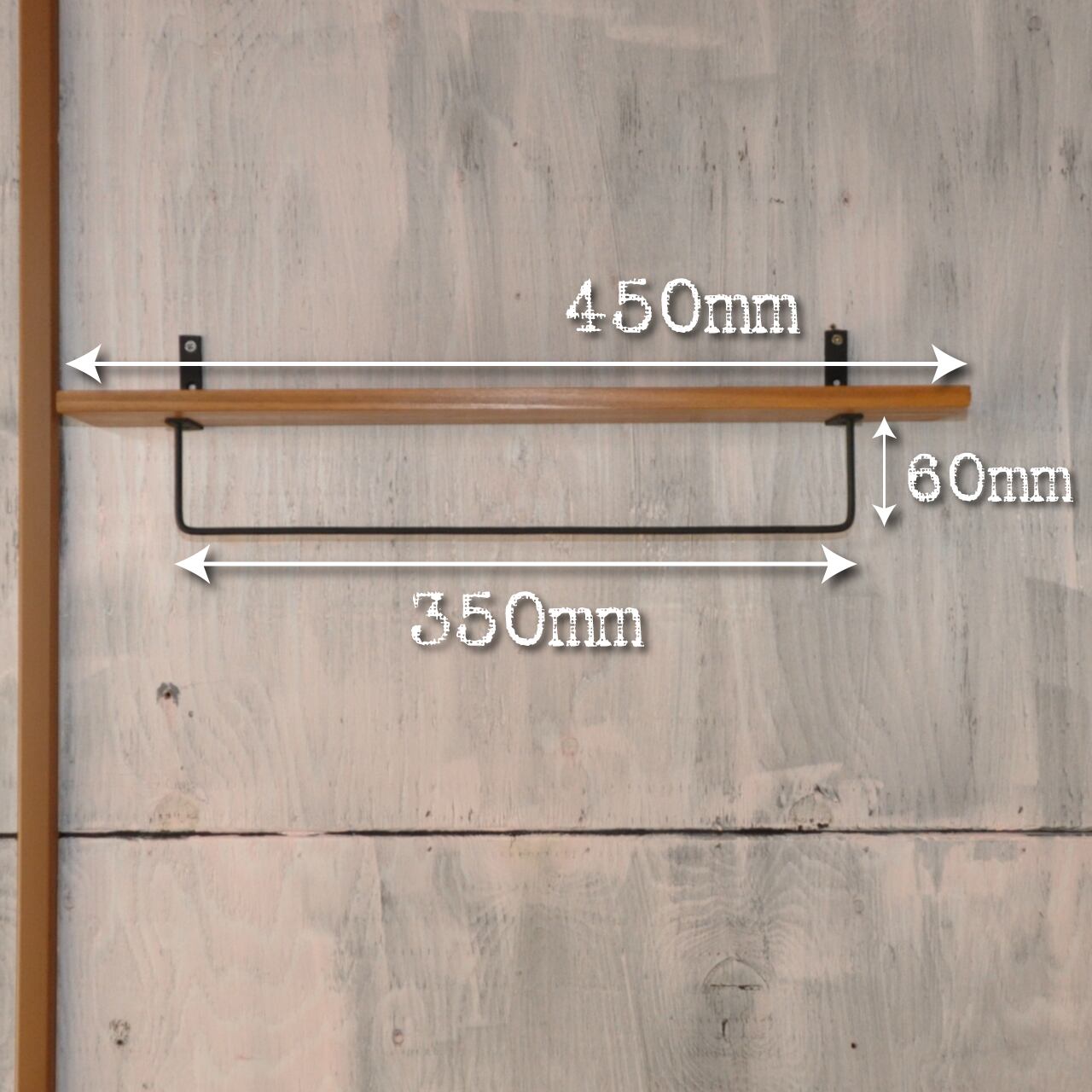 温かみがあるパイン無垢材と繊細なアイアンで作られた壁面シェルフ。